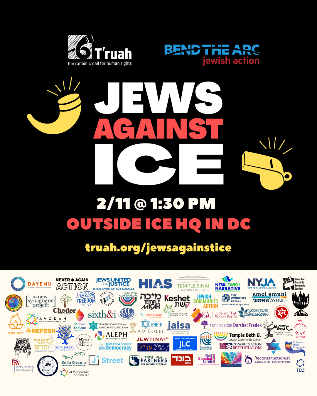 If you are in the DC area or able to travel to DC, you can show up in person to learn, pray, and act together. Over 100 Jewish clergy, leaders of our communities, are coming together from across the country to lead this event. Please bring a shofar if you have one!